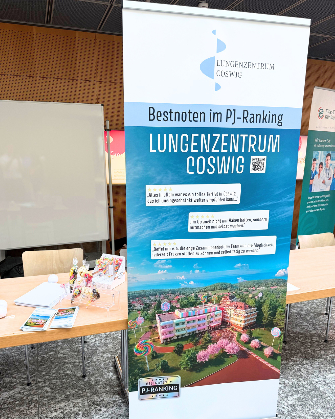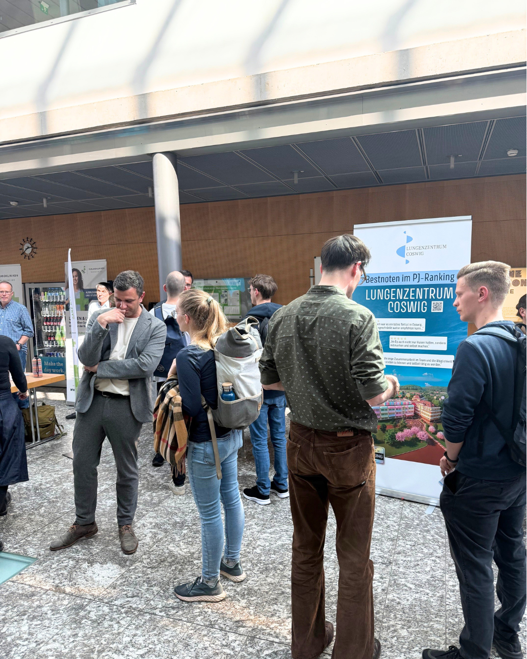 Das Interesse am Lungenzentrum Coswig war hoch. Unser Stand wurde von zahlreichen Studierenden besucht, die sich über die Ausbildungsmöglichkeiten und den klinischen Alltag im Lungenzentrum Coswig informierten. Besonders erfreulich war das spürbar große Interesse, das sich auch auf die sehr positiven Bewertungen unseres Hauses in den vergangenen Jahren zurückführen lässt. Immer mehr Studierende nehmen das Lungenzentrum Coswig als exzellente Adresse für ein PJ Tertial wahr, sowohl fachlich als auch menschlich.
